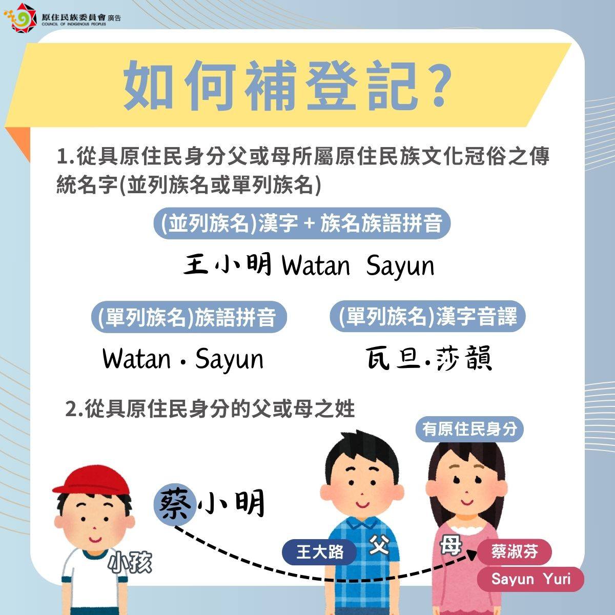 舉例來說,你的媽媽是原住民,爸爸不是原住民,你目前「跟著爸爸姓」,但你小時候是由原住民媽媽單獨監護,就在仍然從父姓的狀況下,自小就取得了原住民身分。