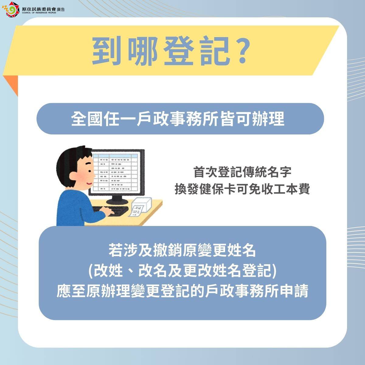 ⚠️依《原住民身分法》110 年 1 月 27 日修正前第 4 條第 3 項規定取得原住民身分者,須於 115 年 1 月 5 日前至戶政事務所完成登記,維持原住民身分。