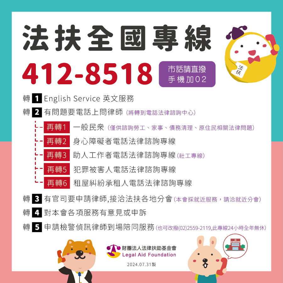 法扶全國專線 412-8518 (市話請直撥,手機加02,點此撥打)